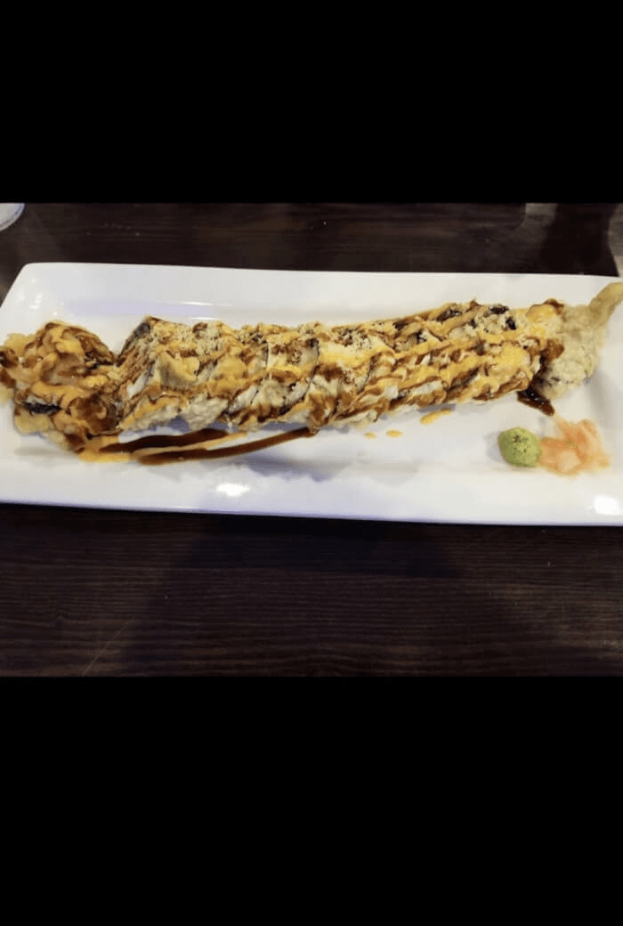 Inside: Shrimp tempura, cream cheese, cucumber, spicy snow crab. Outside: Eel, boiled shrimp, crab meat, avocado, w/eel sauce & spicy mayo.